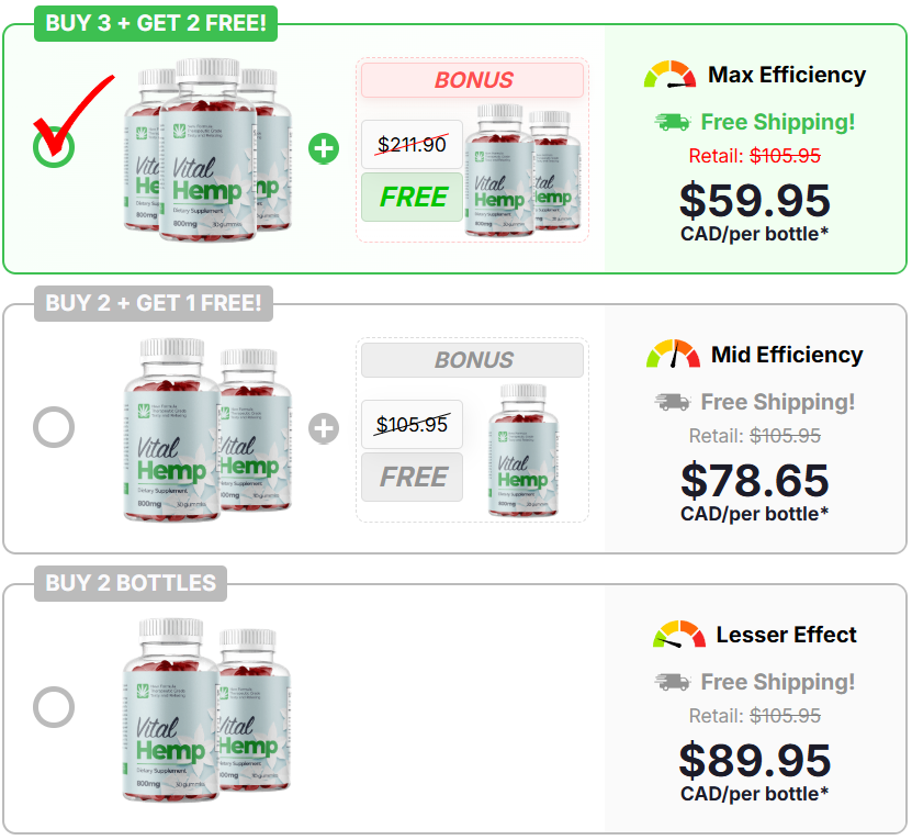 Buy 3 bottles of Vital Hemp Gummies and receive 2 bottles absolutely FREE! This is our most rewarding package, designed to help you maintain your daily balance for longer.
